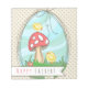 A very cute cartoon children's illustration of a baby chick and a mushroom with a Happy Easter text logo. This whimsical and retro cute image designed by freepik is perfect for a Spring Easter celebration.