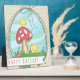 A very cute cartoon children's illustration of a baby chick and a mushroom with a Happy Easter text logo. This whimsical and retro cute image designed by freepik is perfect for a Spring Easter celebration.