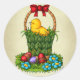 Cute chicken with easter eggs, basket, and blue flowers on grass and vintage beige background. Original ACEO artwork made with Koh-I-Noor Rapidograph (lineart) and Letraset Tria markers (colouring) on Bristol paper.