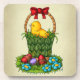 Cute chicken with easter eggs, basket, and blue flowers on grass and vintage beige background. Original ACEO artwork made with Koh-I-Noor Rapidograph (lineart) and Letraset Tria markers (colouring) on Bristol paper.