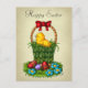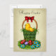 Cute chicken with easter eggs, basket, and blue flowers on grass and vintage beige background. Original ACEO artwork made with Koh-I-Noor Rapidograph (lineart) and Letraset Tria markers (colouring) on Bristol paper.