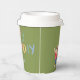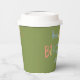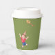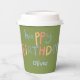 This fun and cute kid's birthday paper cup features a joyful boy flying a kite against a fern green background, with editable custom name.