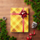 A roll of wrapping paper featuring a bright, cheerful plaid pattern design in egg yolk yellow.