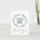 Cute baby boy shower folded thank you card featuring "Thank You" in a stylish script with a heart swash and a watercolor of a pastel blue baby elephant in a wreath of eucalyptus greenery. On the inside, personalise your thank you message and add your name(s) in a signature script, or leave blank for a handwritten note.