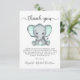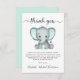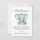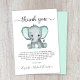 Cute gender-neutral baby shower thank you card featuring "thank you" in a stylish grey script with swashes and a pastel mint green watercolor of a baby elephant. Personalise your thank you message and add your name(s) in a signature script, or leave blank for a handwritten note.