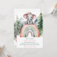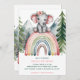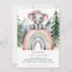 Celebrate the joy of a new arrival with this enchanting watercolor scene, perfect for a baby shower theme. A sweet elephant wearing a pink floral crown sits atop a vibrant rainbow, surrounded by lush green pine trees and majestic mountains in the distance. The soft and dreamy watercolor design adds a magical touch, ideal for a whimsical and heartwarming celebration.
