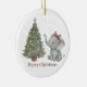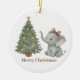 A sweet Christmas ornament featuring a baby elephant with a festive bow, sitting beside a beautifully decorated Christmas tree. Painted in the cosy nostalgic style of Tradition Treasures, this piece adds warmth and charm to any holiday tree. A lovely keepsake for collectors and anyone who adores gentle Christmas artwork.