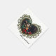 Cute Elf Child in Green Hooded Coat with Christmas Ornament – Magical Fantasy Holiday Design. A cute elf child with big eyes and pointy ears wears a green fur-trimmed hooded coat and holds a glowing orange Christmas ornament. Surrounded by gift boxes with red ribbons, pine branches, and berries, this magical holiday scene feels both festive and mystical. The dark ornate frame with a view into an enchanted forest makes this design perfect for fantasy lovers, Christmas fans, and magical holiday art.