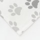 Cute little English Bull Terrier, white with black eye patch, over a background of grayscale paw prints...classical!