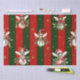 Cute Fairies wearing Santa hats sitting on Christmas ornaments of green, red and white designs against a background of red and green stripes and gold stars.