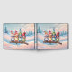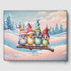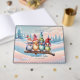 Cute fantasy birds with Christmas hats.The birds are vibrantly coloured, have big eyes that exude joy and curiosity. The background features a soft winter sky in pastel colours, streaked with delicate snowflakes slowly falling. The design exudes warmth and joy, perfectly capturing the festive spirit of the holiday season.