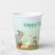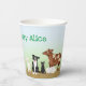 Celebrate a child's birthday party in style with this cute farm animals friends paper party cup featuring a donkey, a goose, a hen and her chicks, a baby goat, a piglet, a rabbit, two lambs, a border collie, a black cat and a cow and her calf. The text can be personalised however you like.