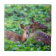 Cute fawn lying down in forest with mother tile