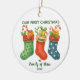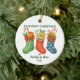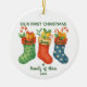 Celebrate your new family milestone with this heartwarming Personalised Family of Three Christmas Ornament! The front features an adorable watercolor design of three festive stockings—red, green, and blue—each custom-personalised with a name (like David, Jenny, and Lauren). The sweet phrase "OUR FIRST CHRISTMAS as Family of three" marks this unforgettable year. With space on the reverse side for a cherished family photo, this ornament is the perfect keepsake to commemorate the arrival of a new child or the formation of your beautiful new family.