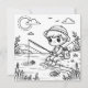 A cute little boy fishing in a lake on a camping trip colouring page. Colour me card for kids!