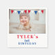 Bunting Flags 1st Birthday Party Napkin with a Photo. Cute birthday party napkin for a 1st birthday party with a custom photo. The design has bunting flags in red, white and blue colours. Personalise it with a child`s photo and the child`s name.