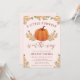 A cute little pumpkin girl baby shower invitation template. This fall design features a pumpkin illustration, greenery flowers, and calligraphy font on a light pink background.