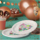 Paper plates with a whimsical heart filled with tropical flowers and leaves in pink, green and yellow colours. The background is a faded pattern with circles in light pink and white. Summery and whimsical design with a vintage flair.