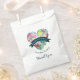 Wedding thank you favour bags. Customise with your names inside a blue-green ribbon layered over a charming heart filled with flowers and leaves in pink, green and yellow colours. Summery and whimsical design. Your wedding date at the bottom and thank you written in a fancy font.