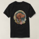 I give wanted to give this a 4 instead of a 5 because these Basic DARK T0shirts run unexpectedly SLIM or Narrow. Which is great if you do not have a potbelly, but I have a paunch. It isn't the shirt's fault that I've got a beer belly. The design and shirt itself is a quality cotton shirt. The color is more of a deep purple, but still a very pretty color. The Basic DARK T-shirts run a bit SLIMMER than the Basic Ts. The neck is a fraction narrower (or seems to be narrower) also. I'm a paunchy middle-aged woman and my neck is 12 inches (31cm) thick and the neckline fell about the same as in the photo of the man, and I had the desire to tug it a bit. So if you're a thick necked man or like loose shirts, be aware these are slimmer shirts. Once I get rid of my lockdown paunch it'll look great. The shirt washed well in cold water with no apparent bleeding. We don't have a dryer, so it hung dry. Did not shrink. Love the colors and the design. The design looks smaller on my shirt than it does on the model on-line. But still, it looks good on the shirt. The printing looks as it does on the model, just the size seems fractionally smaller. Washed garment in cold water, hung dry and design appeared unaffected.