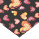 Table runner displaying a pattern of hand drawn and digitally designed, orange, pink, red, purple, yellow, foil textured, plaid hearts on a black background.