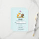 An RSVP card with a cute illustration featuring a baby deer and a little squirrel holding an acorn and a butterfly flying above their heads. These adorable woodland creatures on standing on some grass with some whimsical mushrooms by their feet. Light blue background.
