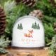 A Christmas design with woodland / forest animals theme. There is a cute red fox on the white snow background, with groups of green pine trees with snow on the sides. The text "let it snow" is in red handwriting script, with the name and year in smaller green letters under it.