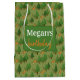 Complete your woodland-themed gift with this delightful personalized gift bag. Featuring a whimsical repeating pattern of tiny orange foxes nestled among lush evergreen trees, this bag is a perfect match for forest birthdays, baby showers, or nature-inspired celebrations. The front showcases a dark green label with "Megan's Birthday" in a clean white and playful orange script, which can be easily customized with your recipient's name and occasion. Available in several sizes, this high-quality gift bag adds a professional and charming touch to any present.