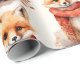 Wrapping paper with an illustration of a reddish orange fox pup. A subtle smile on his face. Wearing a nice red scarf for warmth.
