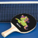 Ping pong paddle with an image of a Frankenstein style unicorn. Purple and green colours. Spooky cute.