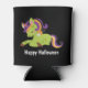 Happy Halloween can cooler with an image of a Frankenstein style unicorn. Purple and green colours. Spooky cute.