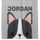 This design features cute French bulldog cartoon illustration with personalised name in grey modern sans serif font style on light grey background.