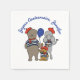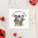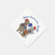 These personalised paper party napkins feature cute cartoon illustrations of animals dressed in French style clothing. There's a brown bear, a little brown rabbit or bunny and a grey poodle wearing classic blue and white striped shirts with red berets and red neckerchiefs. Add your own custom message above in French or any language in blue script lettering.