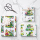 Birthday gift wrap with a watercolor frog sitting on a lily pad surrounded by butterflies and flowers.