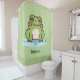 A green shower curtain with an illustration of a cute frog on its pond and customisable text below! Perfect to add a funny touch to your bathroom!