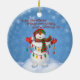 Cute Frosty Snowman Holding Christmas Lights Ceramic Ornament. Design features funny snowman with scarf, hat, gloves holding Christmas lights standing of snow.