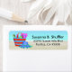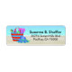 A fun illustration of a beach bag sitting on the sand with a blue hat resting next to it. The background is a sandy beach with pretty blue ocean waters. Personalise this beachy cheerful label with your name and address.