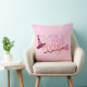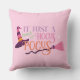 Cute Fun Pink Witch Hocus Pocus Halloween Hat Throw Pillow, Have fun with friends and family with this cute spooky funny personalised Halloween pillow. The stylish typography design features "It's just a bunch of Hocus Pocus" wording yellow, purple and pastel pink, orange, start and witch broomstick, witch hat, in pink background.