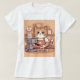 A Cute Funny Barista Cat with Coffee T-shirt with a soft brown and yellow cozy coffee shop background.