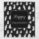 Cute Spooky Halloween fun ghosts, composed of white little happy ghosts on a black pattern. A great design for Halloween party, home decorations.