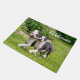Two young happy Boston Terrier puppies, black with white markings, running side by side, carrying a stick and have a lot of fun. The Boston Terrier dog breed also called Boston Bulls or "American Gentlemen". A funny animal photo design by Katho Menden. This photo printing door mat welcome is a gift idea for dog lovers. Personalize it with your name or text.