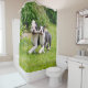 Two young happy Boston Terrier puppies, black with white markings, running side by side, carrying a stick and have a lot of fun. The Boston Terrier dog breed also called Boston Bulls or "American Gentlemen". A funny animal photo design by Katho Menden, this shower curtain is a gift for all dog lovers, all friends who love puppies and furry pets will be happy about this present.