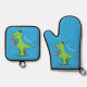 Cute funny green t rex dinosaur cartoon oven mitt & pot holder set