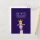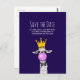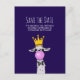 Save the date postcard a whimsical llama blowing a bubble while chewing on gum. Wearing a gold crown and a black bow tie. This cute lama is only visible from the neck up. has a cartoonishly long neck.