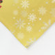 Cute, funny, and also elegant custom-name Christmas fleece blanket for kids with Santa in his red costume (holding a candy cane) and his favourite reindeer, Rudolph, behind him; with the greeting "Merry Christmas!" in cursive script / calligraphy and with very cute Christmas trees with baubles. With a personalised name. The design includes silver and off-white snowflakes and stars for a festive holiday mood. On a partly golden background.