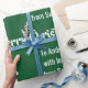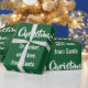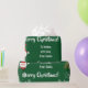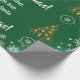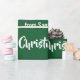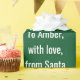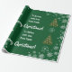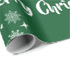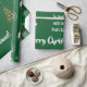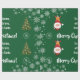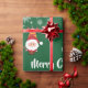 Cute, funny, and also elegant Christmas giftwrap for kids with the words "Merry Christmas" in stylish typography, a personalised dedication now reading "To Amber / with love / from Santa," snowflakes, Santa in his red costume (holding a candy cane) and his favourite reindeer, Rudolph, behind him, and a Xmas tree. On a green background with snowflakes.