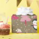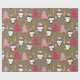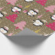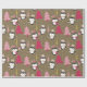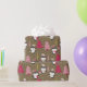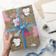 Cute penguins with colourful winter hats are cheerfully waving and holding presents as the snow falls against a neutral background with pink Christmas trees. Very cute paper for any kid's Christmas or holiday gift.