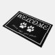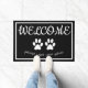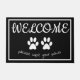 This cute and funny custom door mat features a pet theme for animal lovers or homes with dogs or cats. A set of paw prints are printed in the centre, beneath a "Welcome" greeting. The phrase "please wipe your paws" is printed below the paws.