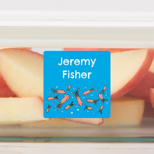 Features our funny cartoon squid swimming in a sea of bubbles pattern. Calamari anyone?