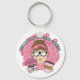 Cute keychain for the Christian woman. A lady is holding a cup of coffee and a bouquet of pink flowers. Text says, "Runnin' on Jesus and coffee."